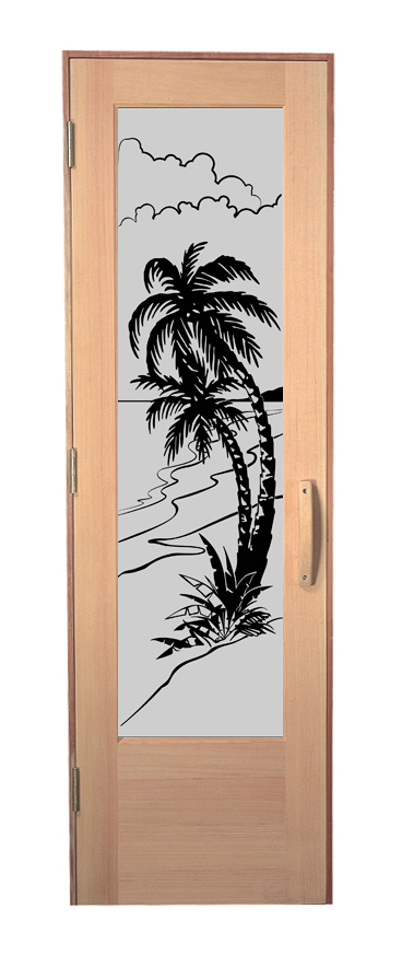 Our exclusive glass options have been custom designed and etched by an artist. When ordering this option, you have a choice of our unique Sauna Scene, Rustic Sauna, Birch, or Palm designs in positive or negative image, or a choice of our beautiful Scenic Designs: Mt. Hood, Multnomah Falls, Liberty, Lighthouse, or Sailboat. Areas of the image that appear black are clear/transparent glass. The white areas are frosted/opaque. Artwork is sealed inside the insulated glass unit so that etchings are protected from smudging or scratching. Etchings are available for the 24" door size only.